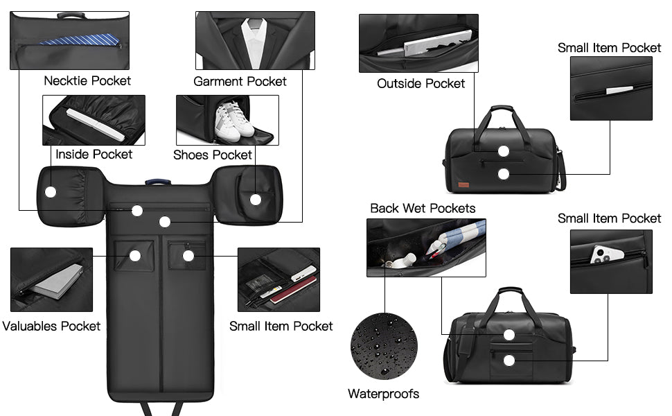 - Separate Shoes Compartment & Wet Pocket: The separate shoe compartment is designed with 2 air hole to keep the garment duffle bag clean and ventilated. The wet pocket with waterproof material can store wet items or post-workout clothing such as underwear, swimwear, towels, etc. to keep your main compartment dry.
